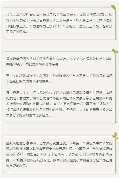 第二日的十色實操日程中,在達科為流式技術團隊指導下,每位參加的學員均有機會自己操作前期染色和后期數據處理,并且由深圳先進院的詹五根老師演示上機,大家收獲頗豐,參與學員人數達到40余人。