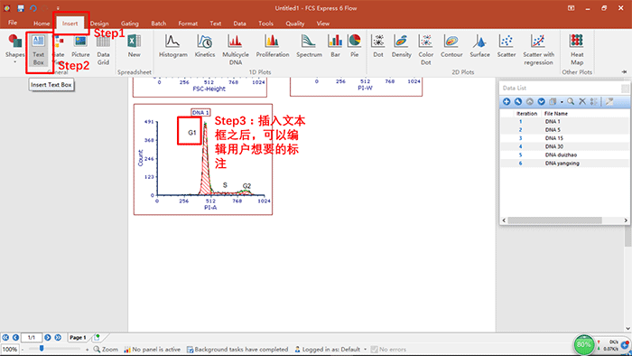 b.將細胞周期分析的模板調出來之后,點擊OK,會彈出如下圖所示的界面,然后可以利用insert按鈕,插入文本框,從而可實現圖注的編輯,如下圖所示(我們可以對圖中的每個峰進行命名,從而可以對細胞周期中的各個時期進行命名和解釋):