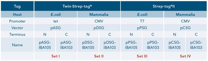 SetⅠ與SetⅡ為Twin-Strep-tag?(三代純化標簽),SetSetStrep-tag?II(二代純化系統)標簽。每組載體包含兩個1μg帶Amp抗性的載體,分別為TagN-TermC-Term的載體