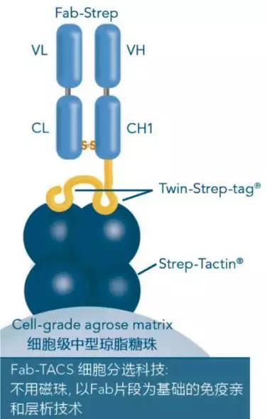 以Fab片段為基礎的無痕親和細胞分選技術(traceless affinity cell selection, Fab-TACS),由IBA Lifesciences根據其獨家的Strep-tag?/Strep-Tactin?蛋白純化系統發展而來。Fab-TACS運用免疫親和層析的原理,利用細胞表面抗原分子CD marker與Fab片段的特異性結合來進行捕捉及釋放目標細胞。以不具磁性且可逆的試劑,取代一般具高親和力的完整抗體, 直接由全血或其他血液樣本來進行溫和的標準化分選,因此能精準的提供您不含標記、未被活化的目標細胞。
