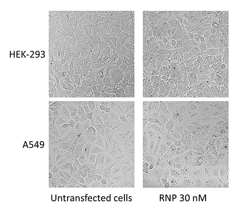 在96孔板中用30nm RNP(Cas9蛋白和HPRT1 sgRNA)和0.3 μl的jetCRISPR?轉(zhuǎn)染HEK-293和A549細胞,轉(zhuǎn)染48h后,使用phase contrast ZOE Fluorescent Cell Imager (BIORAD?)觀察細胞狀態(tài)。