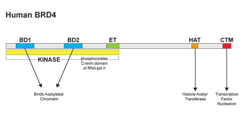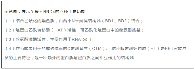 溴結(jié)構(gòu)域蛋白的BET家族的主要特征是它們都存在兩個(gè)溴結(jié)構(gòu)域和一種超末端(ET)結(jié)構(gòu)域2,6。其中,BRD4是研究較深入的。 BRD4具有四個(gè)主要的分子功能:(i)可以通過(guò)結(jié)合乙酰化組蛋白維持染色質(zhì)結(jié)構(gòu),這種活性是由它的N-末端結(jié)構(gòu)域中的位點(diǎn)調(diào)控的; (ii)可以通過(guò)其HAT催化結(jié)構(gòu)域發(fā)揮組蛋白乙酰轉(zhuǎn)移酶(HAT)活性2,6; (iii)絲氨酸激酶活性,主要作用于RNA pol II;(iv)C端結(jié)構(gòu)域,可以發(fā)揮轉(zhuǎn)錄因子和復(fù)合物的結(jié)合和成核位點(diǎn)。研究發(fā)現(xiàn),BRD4常出現(xiàn)在幾種轉(zhuǎn)錄復(fù)合物,包括常見(jiàn)的輔因子調(diào)控子和P-TEFb 延伸因子6。 其C端結(jié)構(gòu)域也可以調(diào)控BRD4與許多眾所周知的轉(zhuǎn)錄調(diào)節(jié)因子之間的相互作用,顯著的有:P-TEFb,MYC,NFκb 以及p532,4,6-8等。