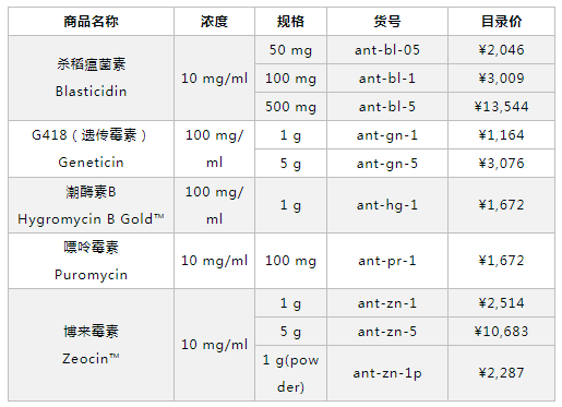 達(dá)科為生物是InvivoGen公司在中國(guó)的一級(jí)代理,并且和InvivoGen一直都有良好的合作,達(dá)科為準(zhǔn)備了大量InvivoGen篩選抗生素現(xiàn)貨,即日起篩選抗生素下列現(xiàn)貨參加6折促銷活動(dòng):