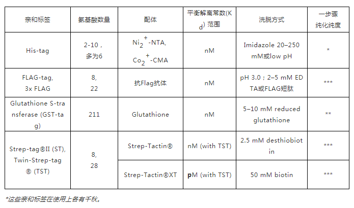 首先,需考慮選擇合適的親和標簽。常用于哺乳動物表達系統的親和標簽有His-tag、FLAG-tag、GST-tag及Strep-tag?等[4-12],整理于下表: