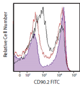 (將小鼠脾臟細胞分別用TruStainFcX TM PLUS0.25μg/test,紫色填充直方圖),TruStainFcX TM(克隆93,1μg/test,紅線)封閉之后用CD90.2FITC染色,與未處理的小鼠脾臟細胞(黑線)作比較。結果顯示TruStainFcXTM PLUS封閉效果更優(yōu)。)
