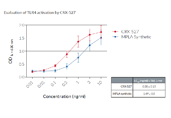 將細(xì)胞分別與遞增濃度的CRX-527、合成的單磷酰脂質(zhì)A(MPLA)孵育。在HEK-BlueTM檢測(cè)培養(yǎng)基(SEAP檢測(cè)生長(zhǎng)培養(yǎng)基)中孵育過(guò)夜后,通過(guò)測(cè)定上清液中是否存在SEAP來(lái)評(píng)估TLR4的活化。數(shù)據(jù)表示為OD(λ=630nm)(±SEM)