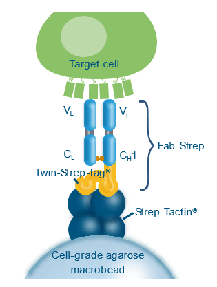 Fab-TACS柱子填充了包被有Strep-Tactin? 多聚體的細胞級瓊脂糖基質,偶聯上Strep-tag的Fab片段(Fab-Streps)特異性的結合到瓊脂糖基質上。隨后,加入全血或其他血液制劑流過柱子。目的細胞通過特異性的與Fab-Streps作用從而結合到瓊脂糖基質上,其他非目的細胞則有效的被洗去。最后,加入生物素使目的細胞從Fab-Streps上解離。至此,就已分離得到不帶任何標記的、真實的目的細胞可用于下游的實驗研究。