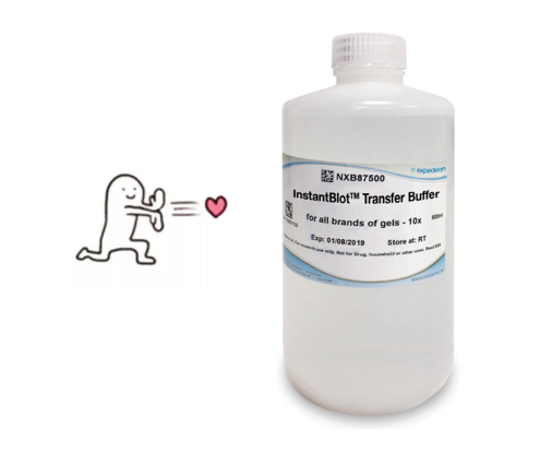 當(dāng)然蛋白電泳只是WB實(shí)驗(yàn)的第一步,那還有什么方法能加快后續(xù)實(shí)驗(yàn)(如轉(zhuǎn)膜)進(jìn)程呢?別急,今天就給大家介紹一款來自分子產(chǎn)品專家Expedeon公司的快速轉(zhuǎn)膜液——InstantBlot?Transfer Buffer(貨號(hào):NXB87500),作為Expedeon的一款專利產(chǎn)品,該轉(zhuǎn)膜液能夠大幅提升蛋白從“膠”至“膜”的轉(zhuǎn)移速度,最快只需10 min即可完成轉(zhuǎn)膜,并且不會(huì)產(chǎn)生過多的熱量,避免影響蛋白的后續(xù)檢測(cè)。