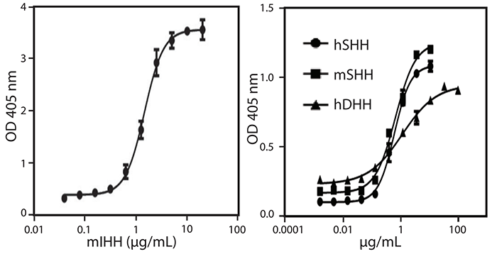 C3H10T1/2干細胞培養至細胞融合,使用BMP-9(20 ng/mL, Cat. No. 553102)和不同濃度的h/mSHH、或hDHH、或mIHH(Cat. No. 753502, 754602, 759802,758602)處理,將間充質干細胞誘導分化為成骨細胞。使用對硝基苯磷酸酯作為底物,檢測成骨細胞標記物堿性磷酸酶。