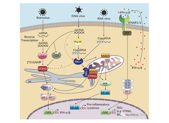 天然免疫系統對于限制病毒感染作用重大。其依靠若干組模式識別受體(PRRs)來識別病毒核酸[1]。這些PRRs包括胞漿DNA感受器(CDS),環鳥苷酸腺苷酸合成酶(cGAS),和細胞質RNA感受器視黃酸誘導基因I(RIG-I)。這些受體一旦被活化, 將誘導不同的信號通路導致一系列抗病毒分子的產生。有趣的是,有證據表明,這些信號通路之間存在緊密聯系以增強抗病毒反應。